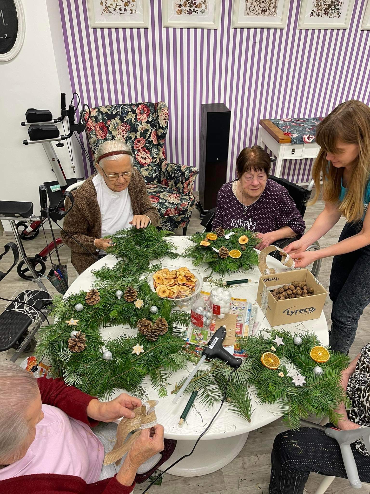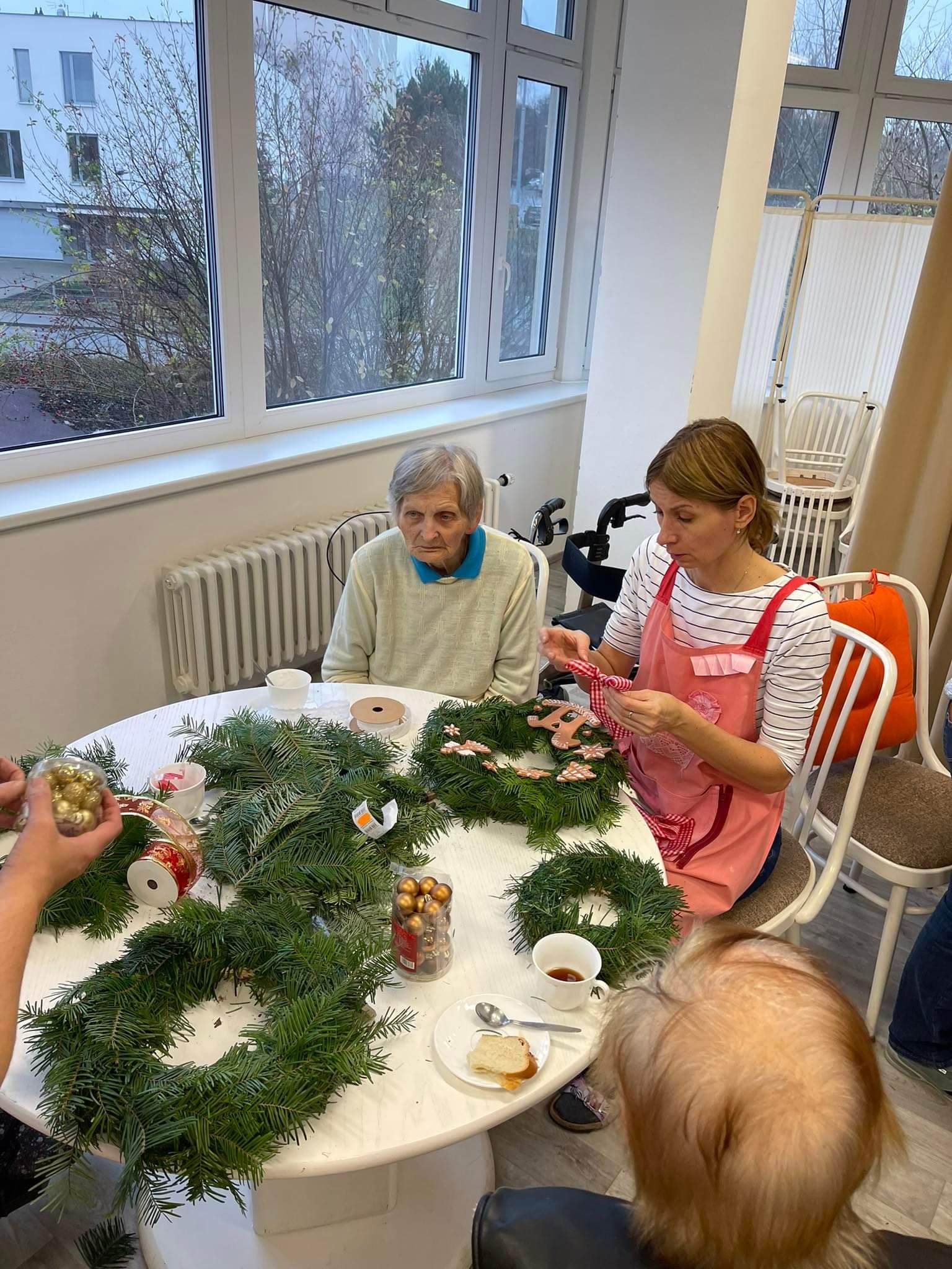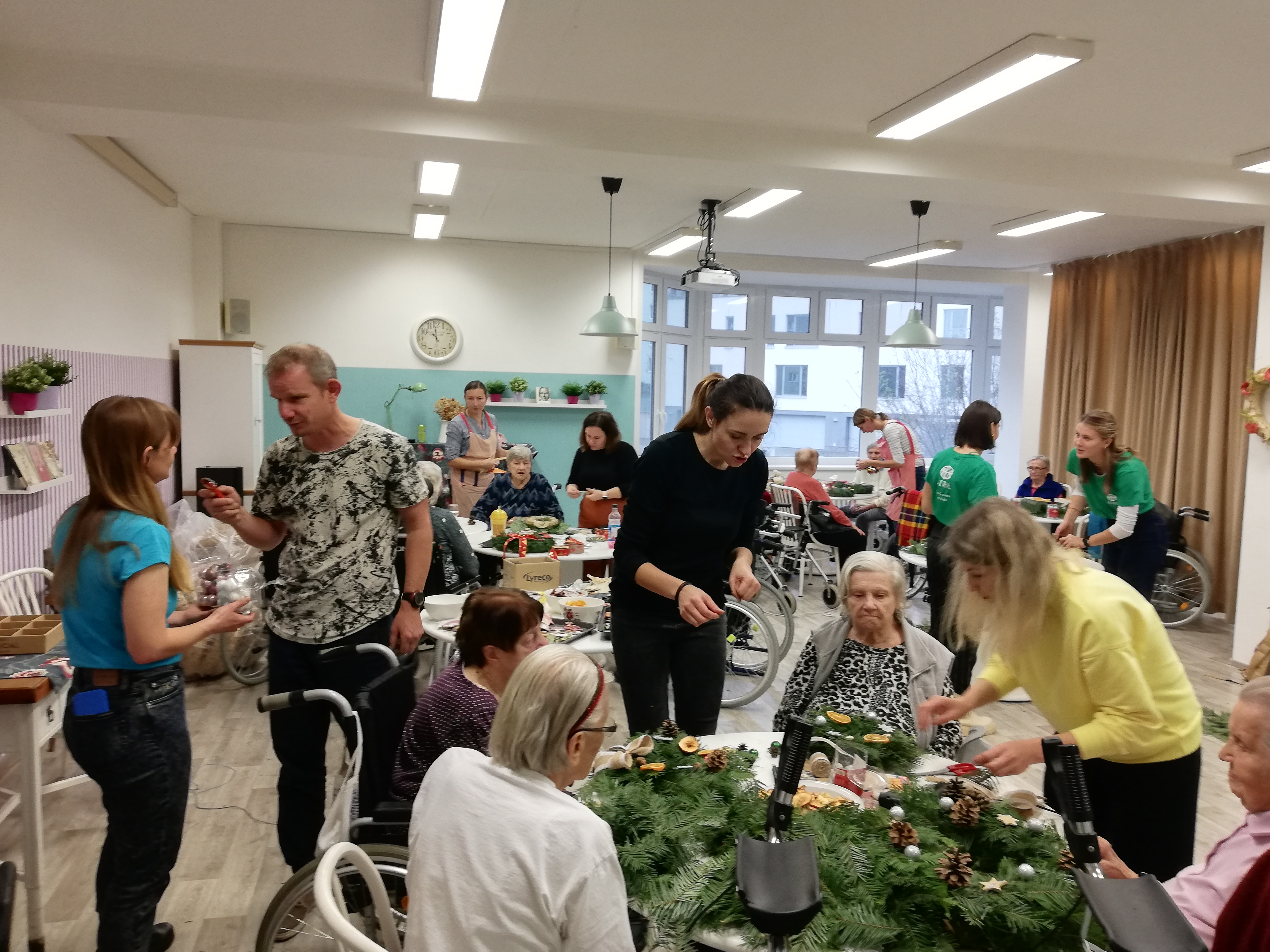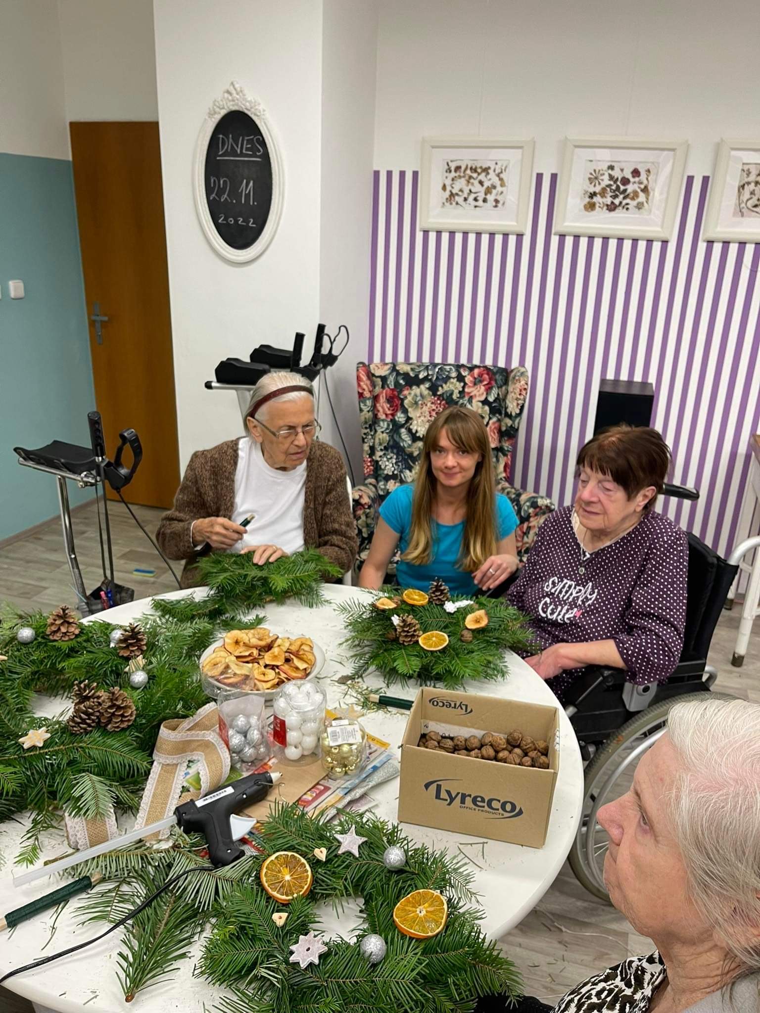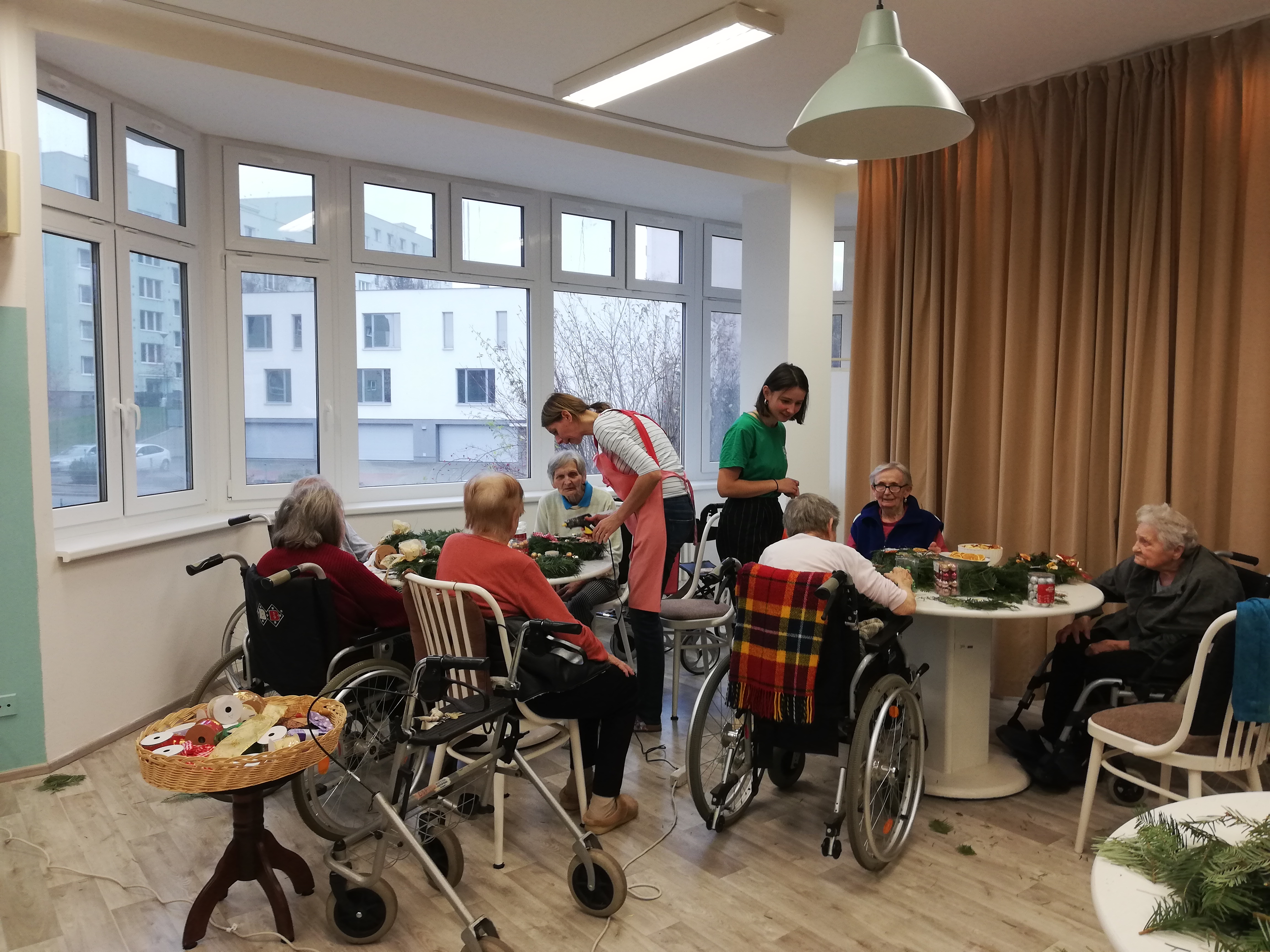 V úterý 22. 11. 2022 proběhla v prostorách společenské místnosti tvůrčí dílna zaměřená na tvorbu adventních věnců. Akci jsme připravily ve spolupráci s dobrovolnickou organizací Adra. Zaměstnanci Adry - zahradníci a dobrovolníci z Ukrajiny našim klientkám pomáhali s přípravnými pracemi i aranžováním. Akce se vydařila, zúčastněné klientky si do svých BJ odnesly hotové adventní věnce.