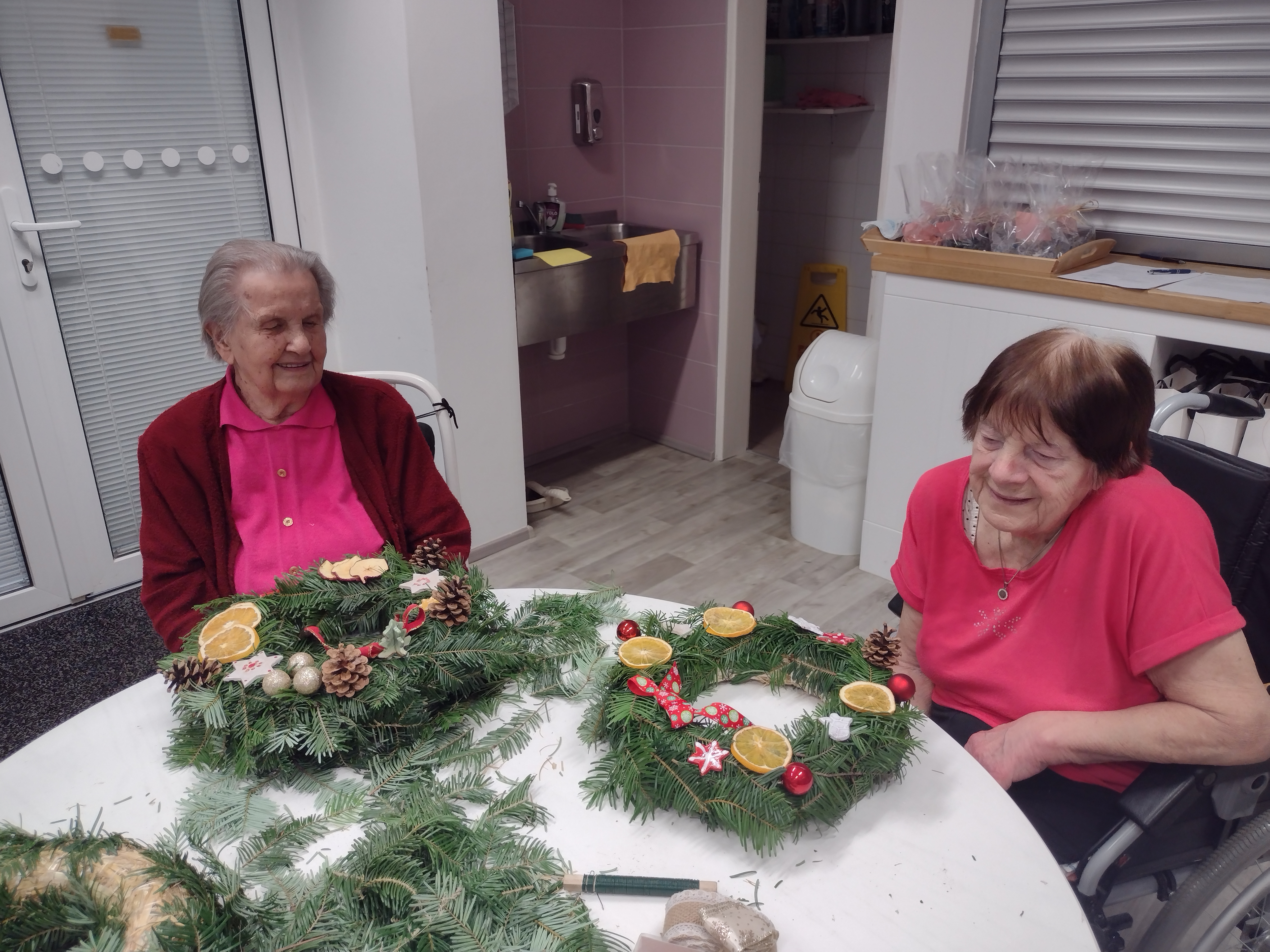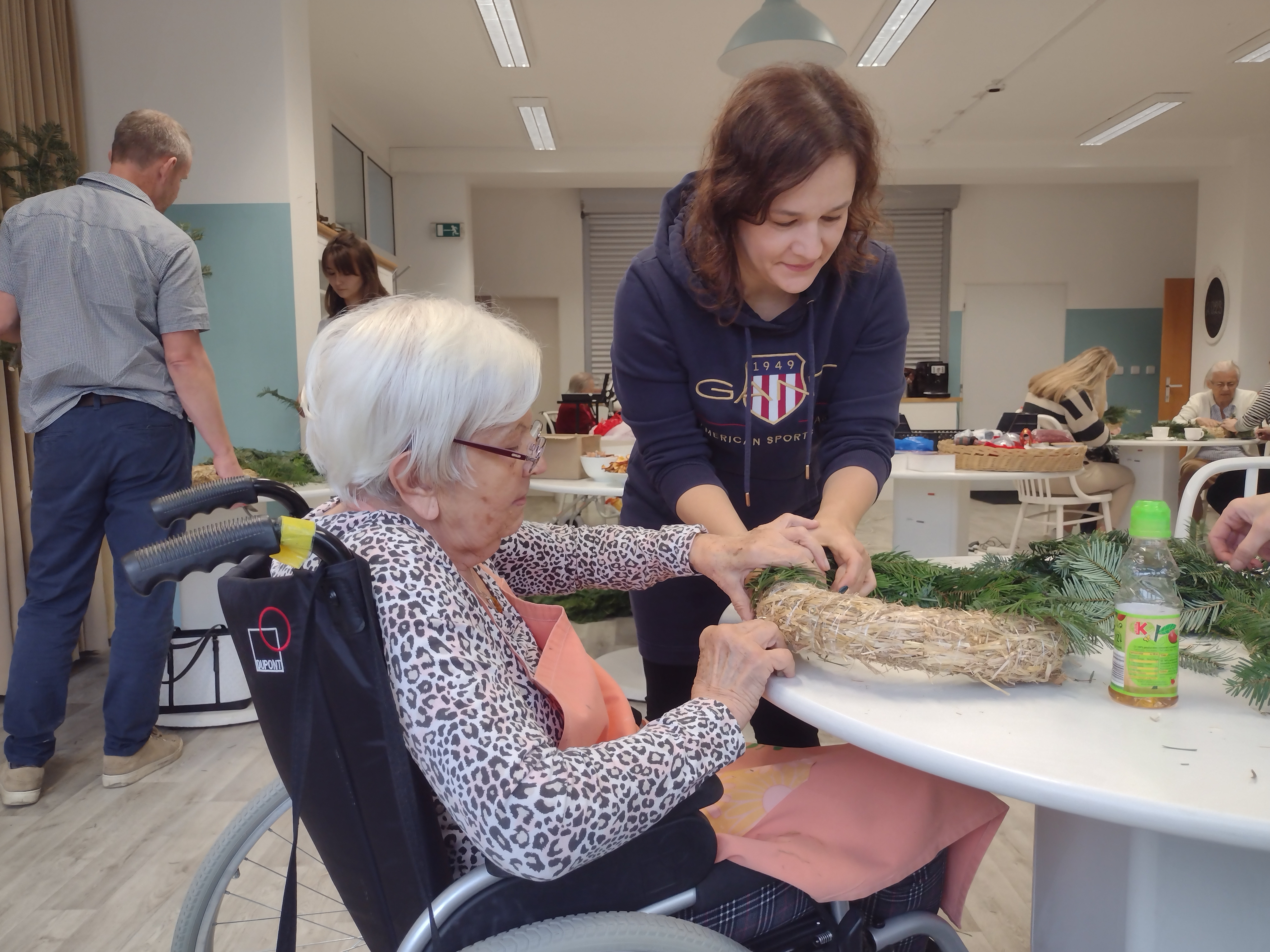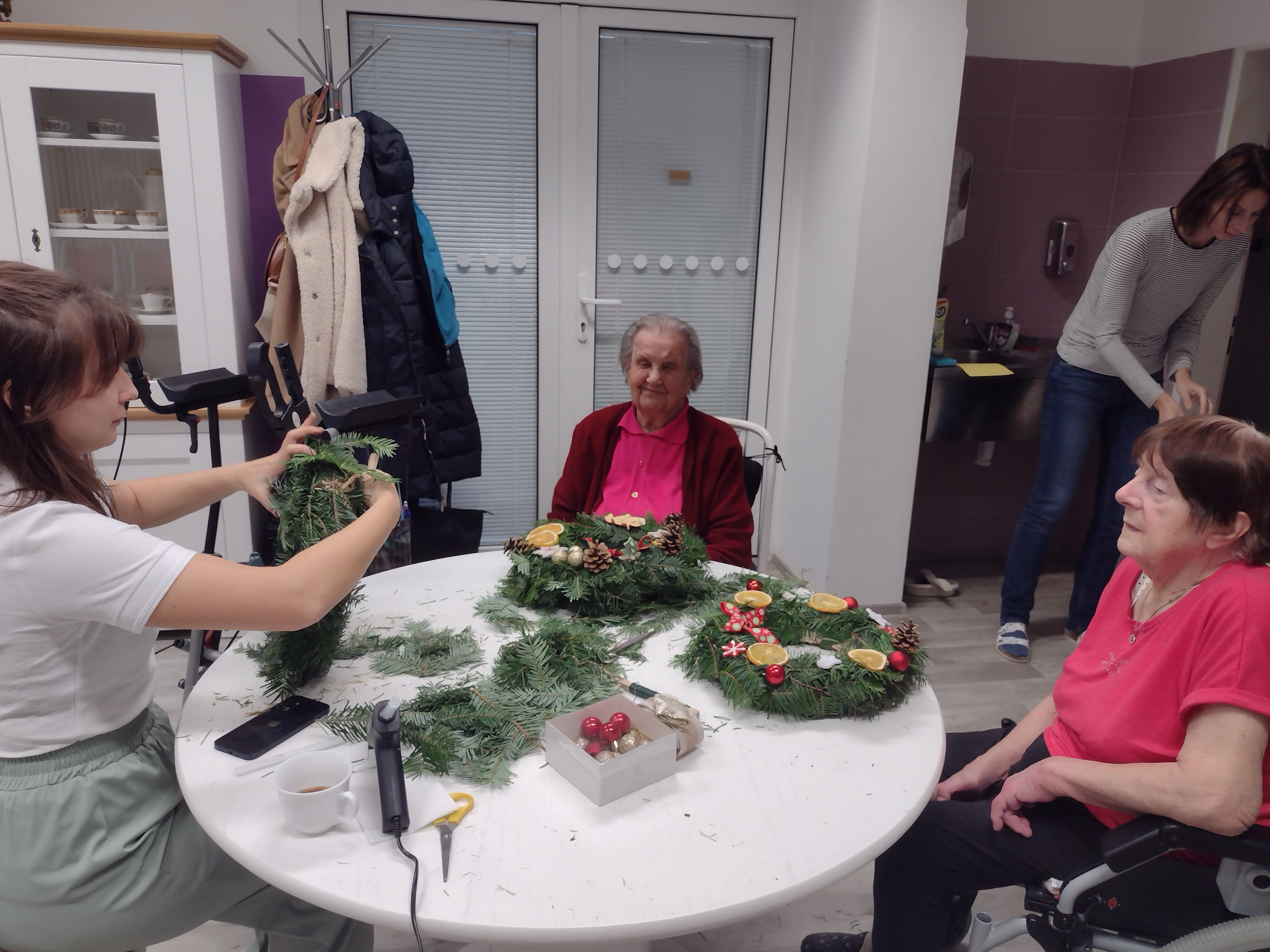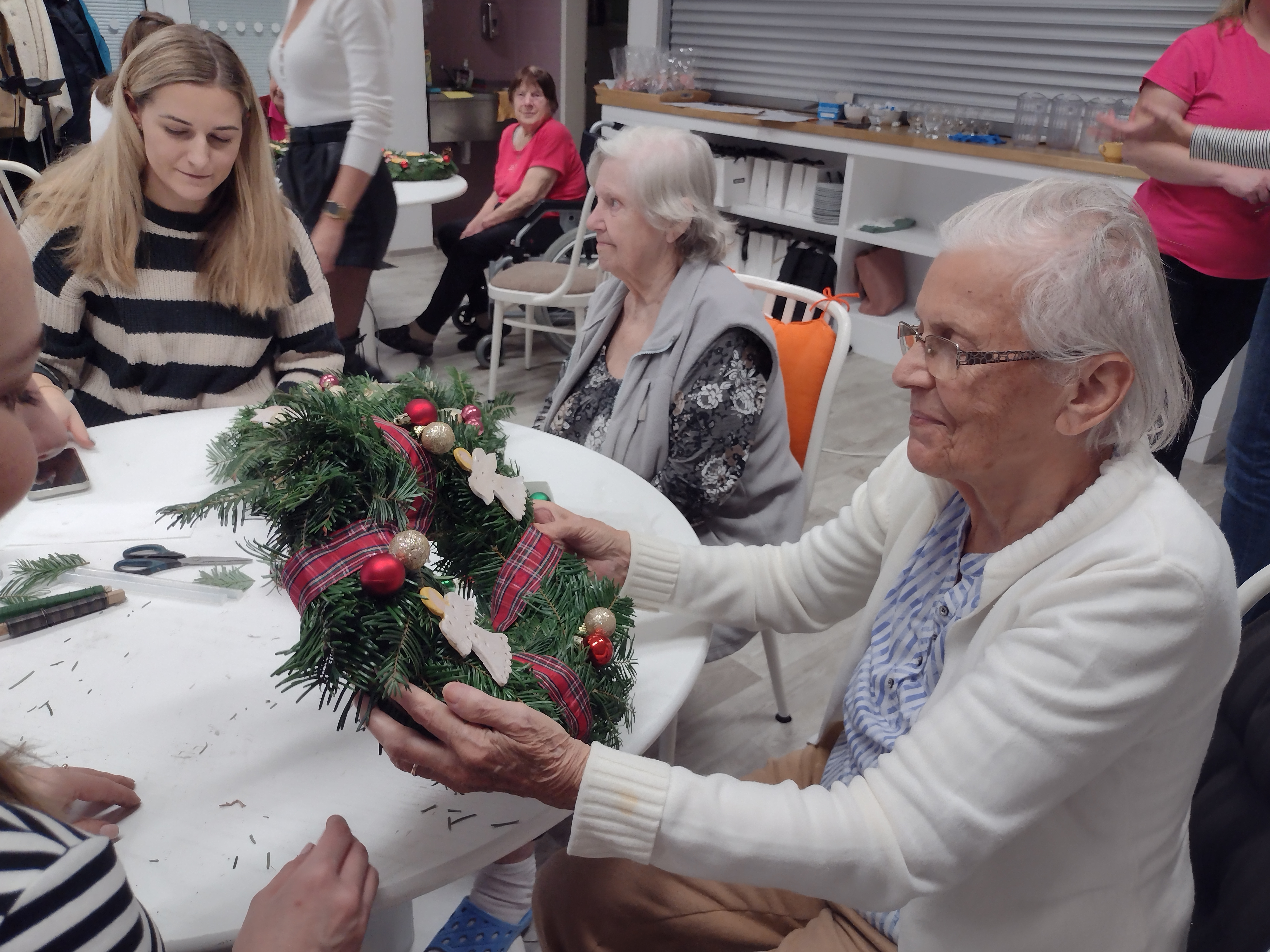 V pondělí 20. 11. 2023 proběhla v našem Domově tvůrčí dílna zaměřená na tvorbu adventních věnců. Akci jsme připravily ve spolupráci s dobrovolnickou organizací Adra. Našim klientům při tvoření pomáhala skupinka zaměstnanců společnosti Notino, s.r.o. a také zahradník, pan Petr. Zaměstnanci společnosti Notino s.r.o. si pro klienty připravili překvapení v podobě dárkových tašek s různými kosmetickými produkty.