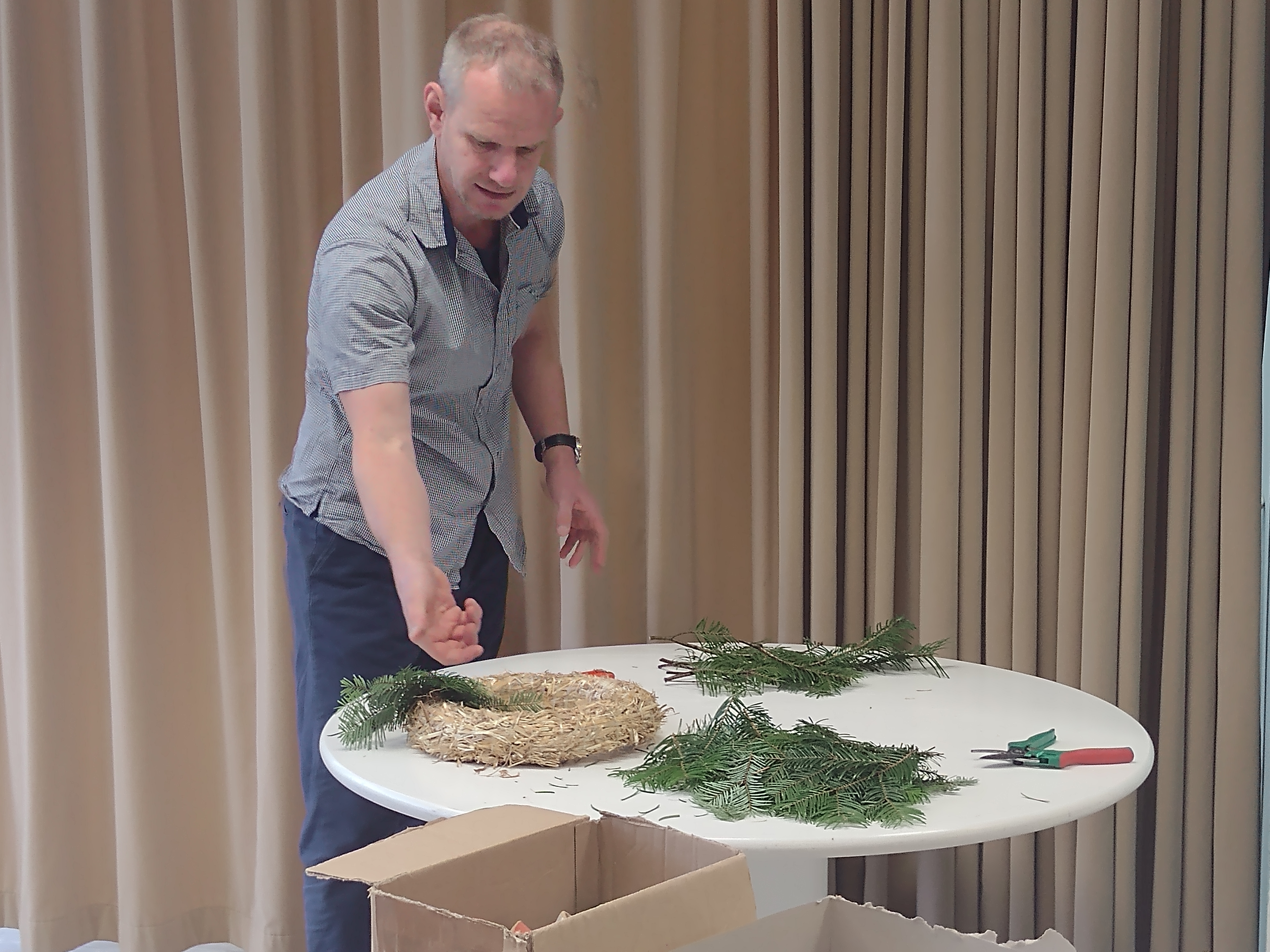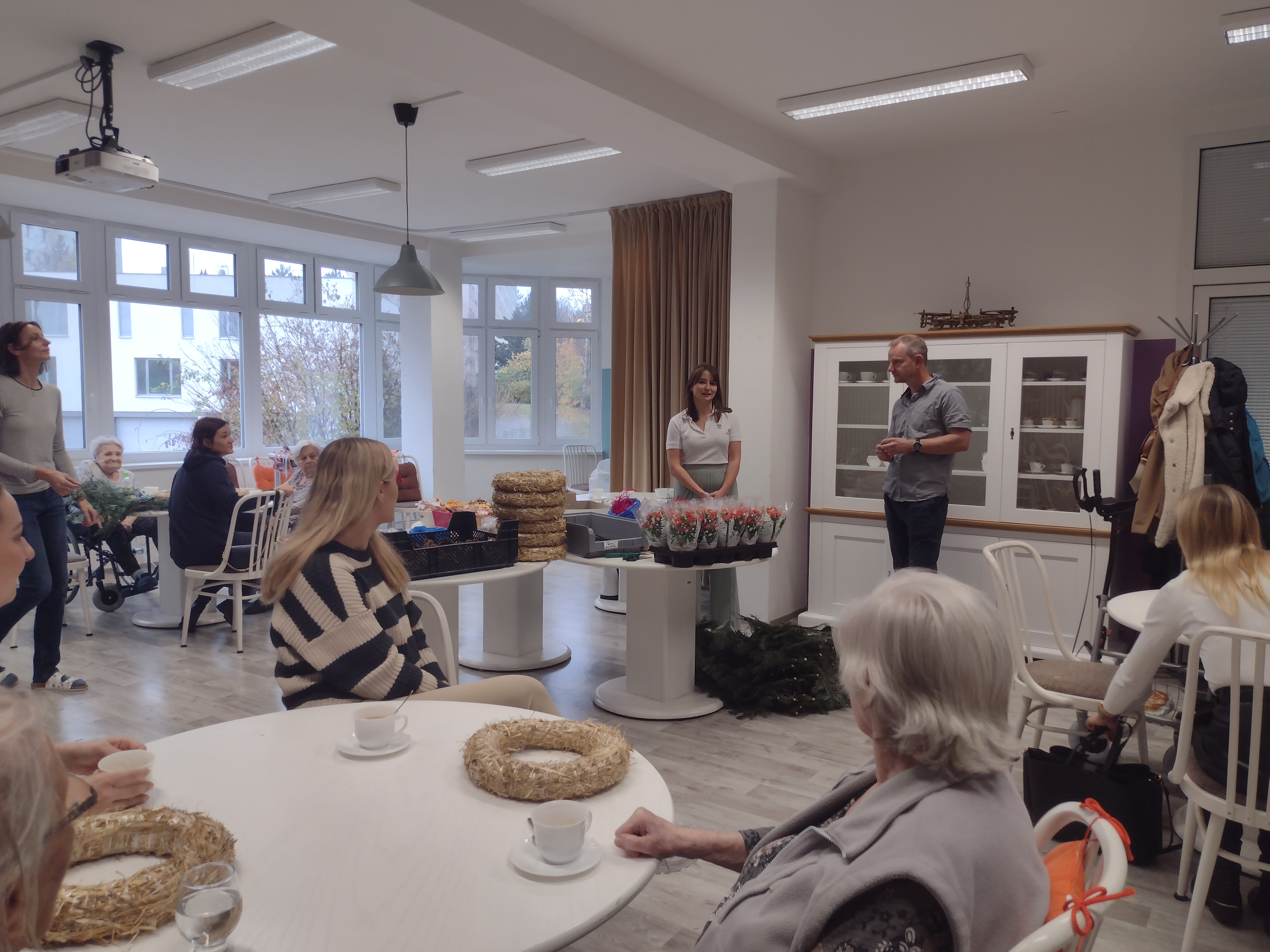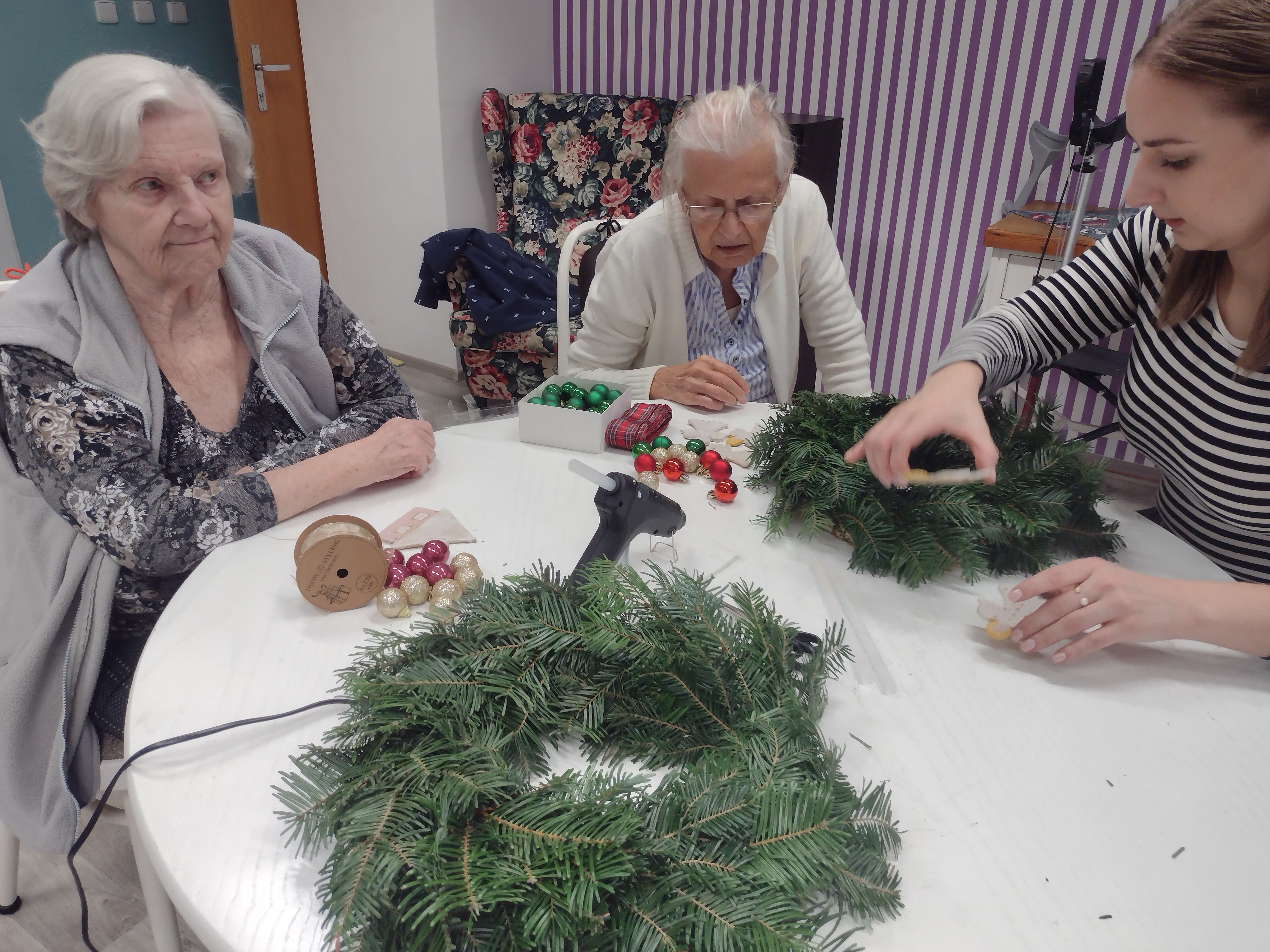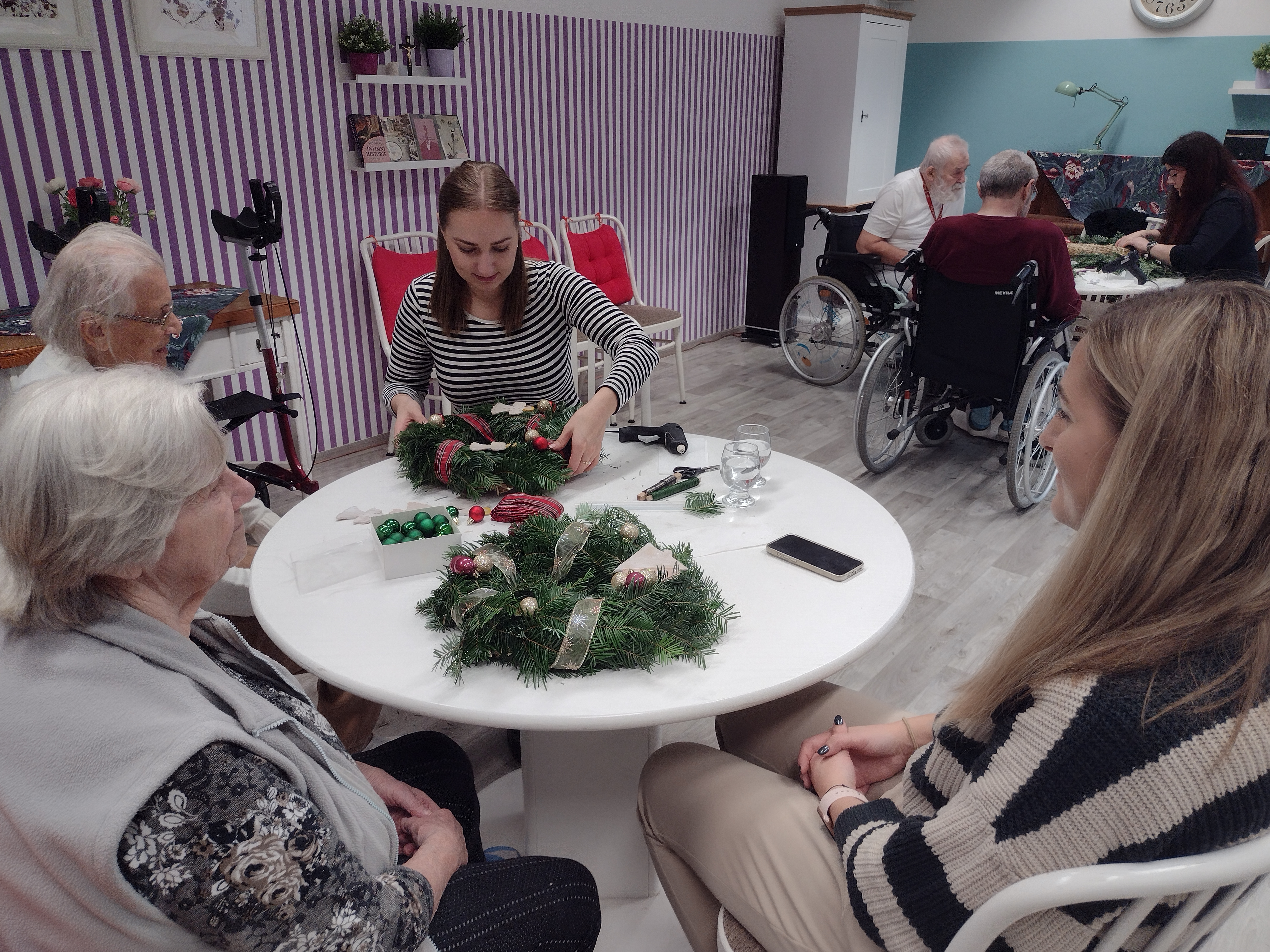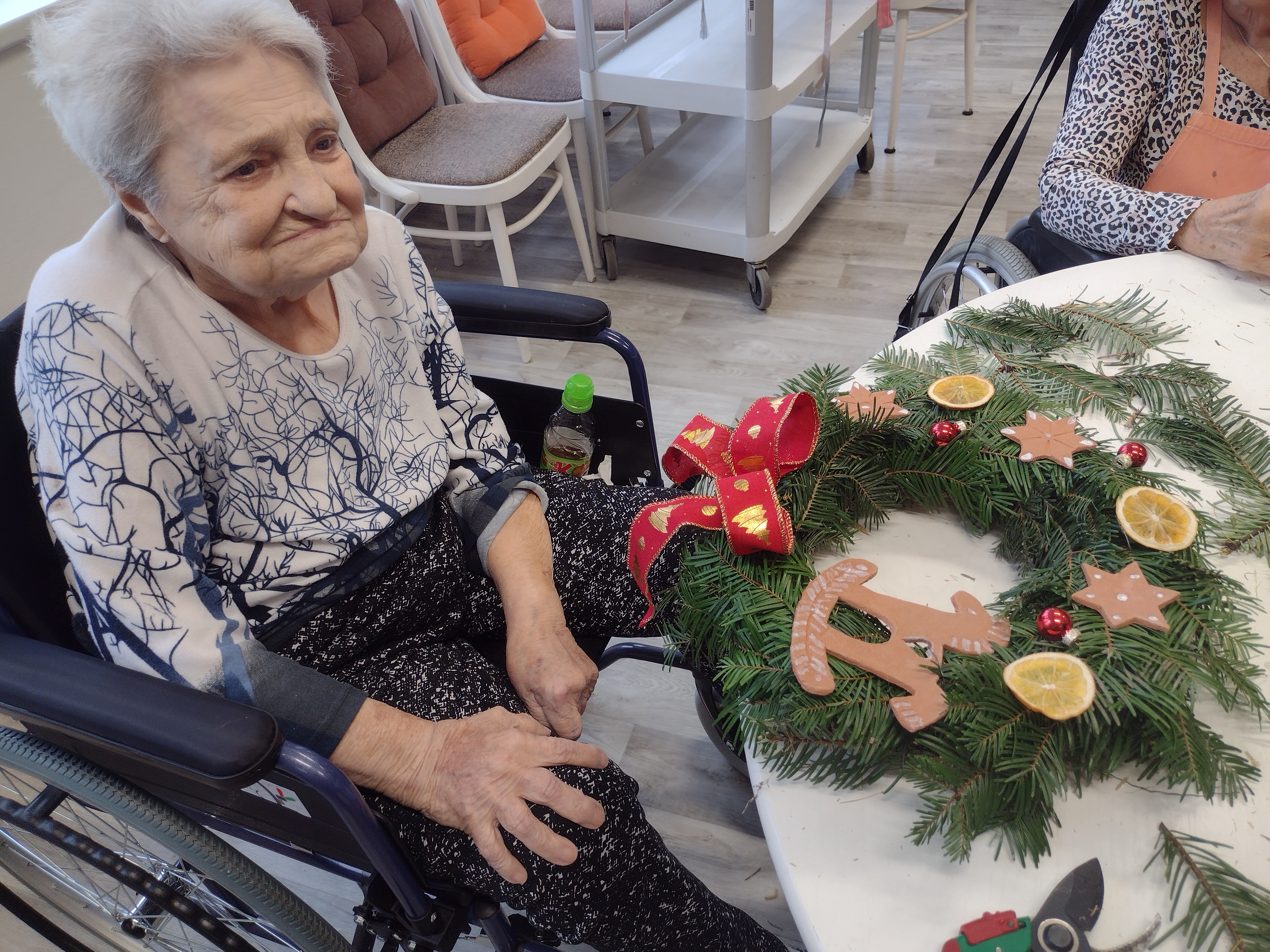V pondělí 20. 11. 2023 proběhla v našem Domově tvůrčí dílna zaměřená na tvorbu adventních věnců. Akci jsme připravily ve spolupráci s dobrovolnickou organizací Adra. Našim klientům při tvoření pomáhala skupinka zaměstnanců společnosti Notino, s.r.o. a také zahradník, pan Petr. Zaměstnanci společnosti Notino s.r.o. si pro klienty připravili překvapení v podobě dárkových tašek s různými kosmetickými produkty.