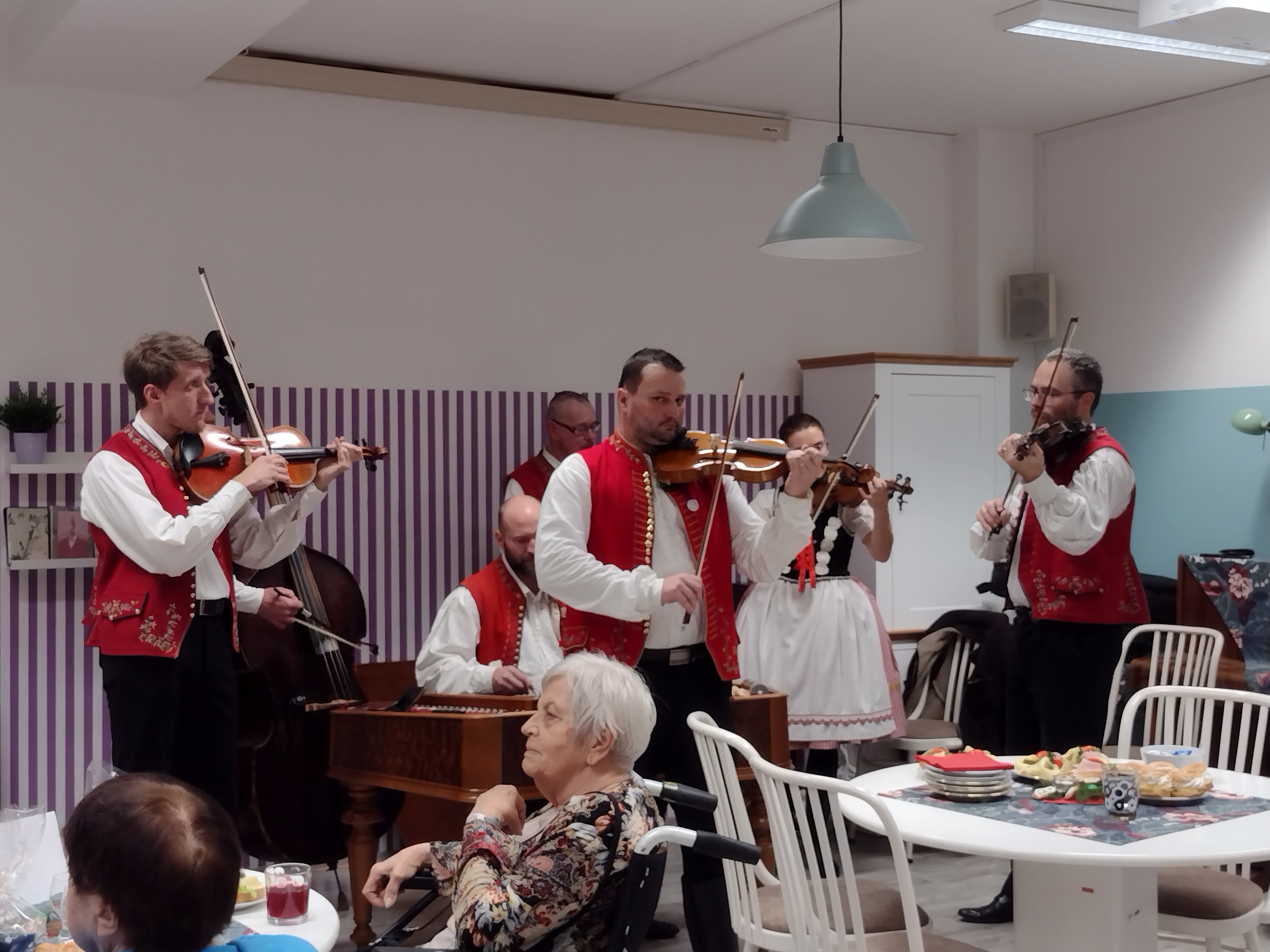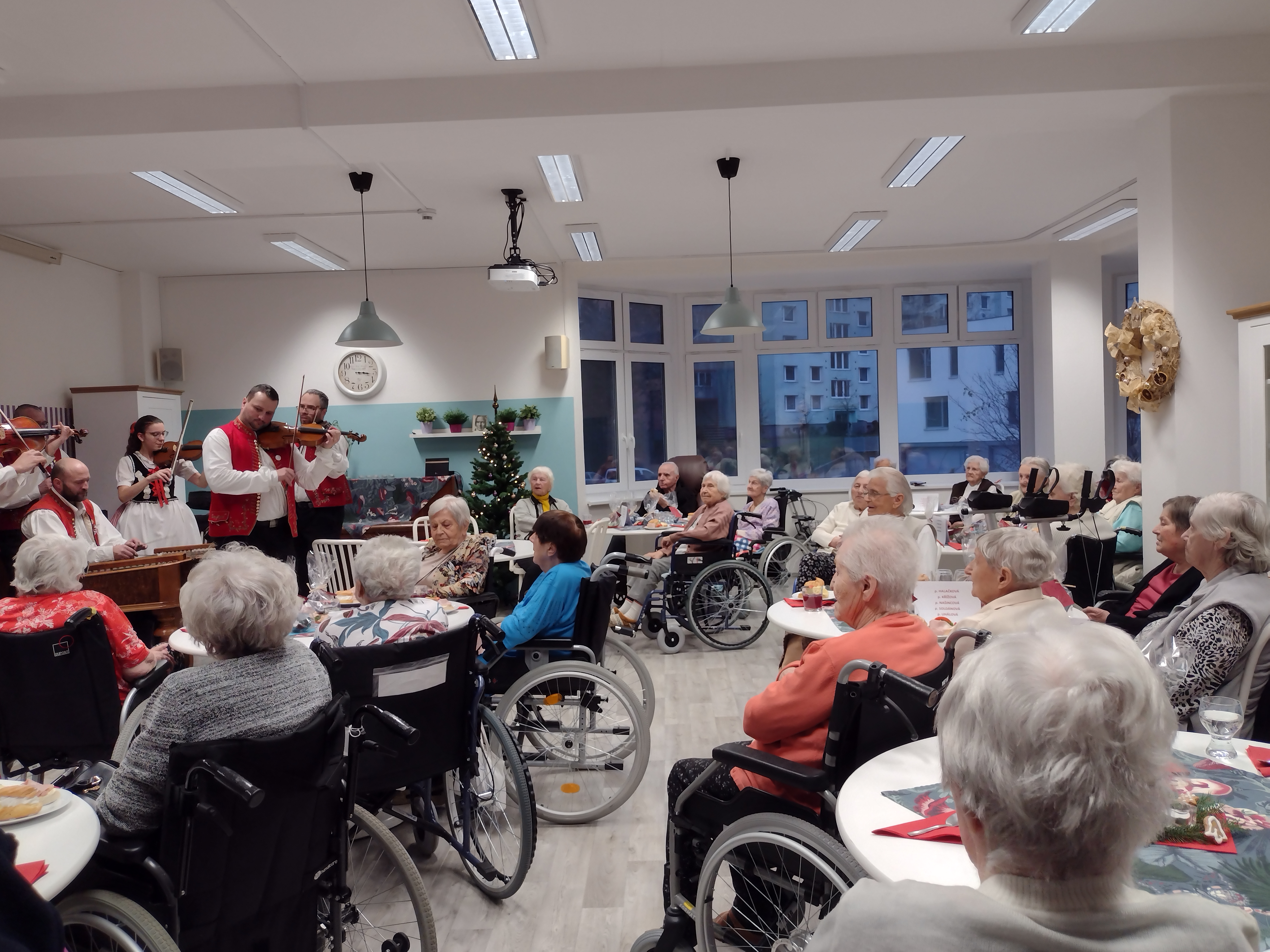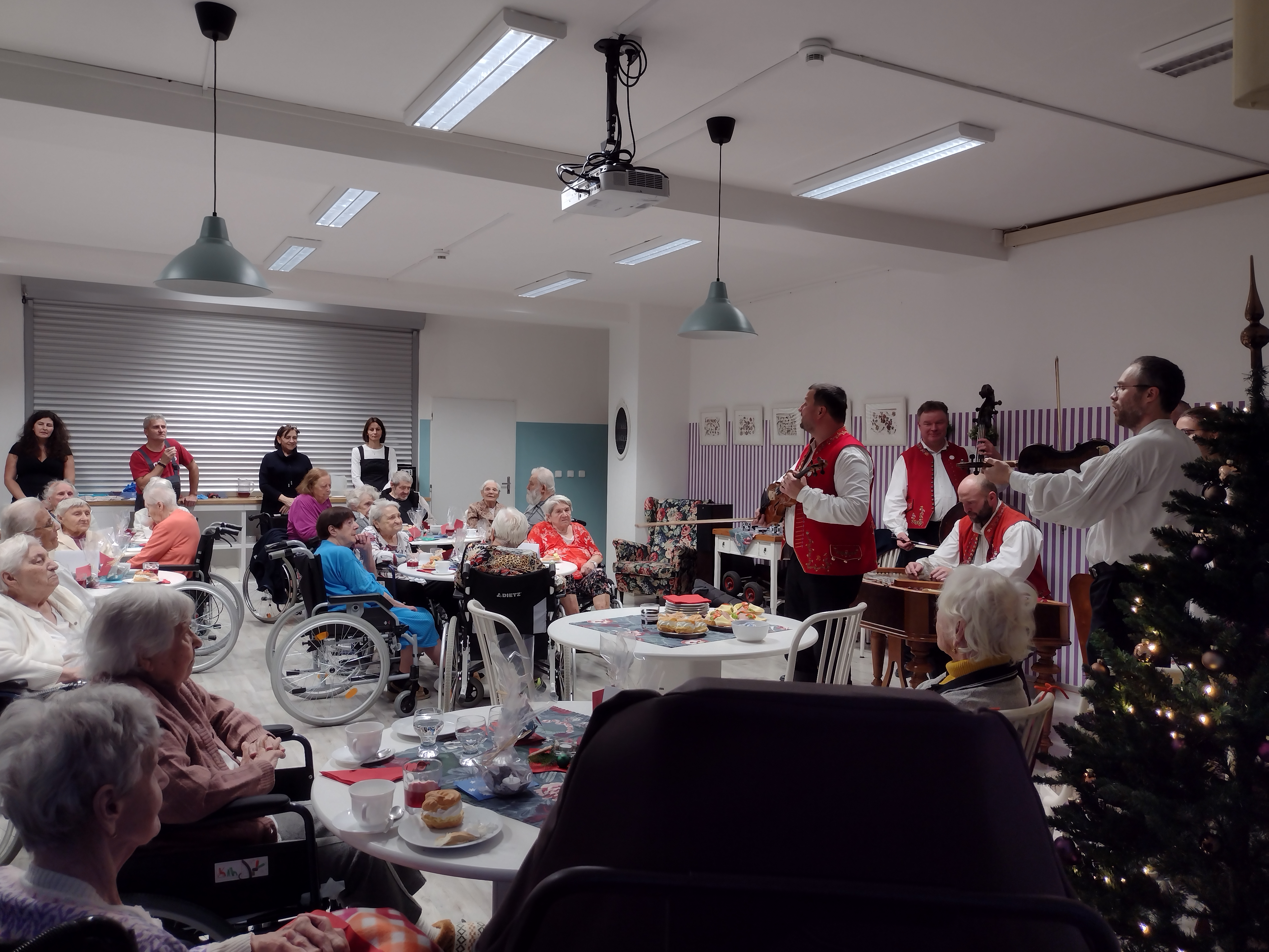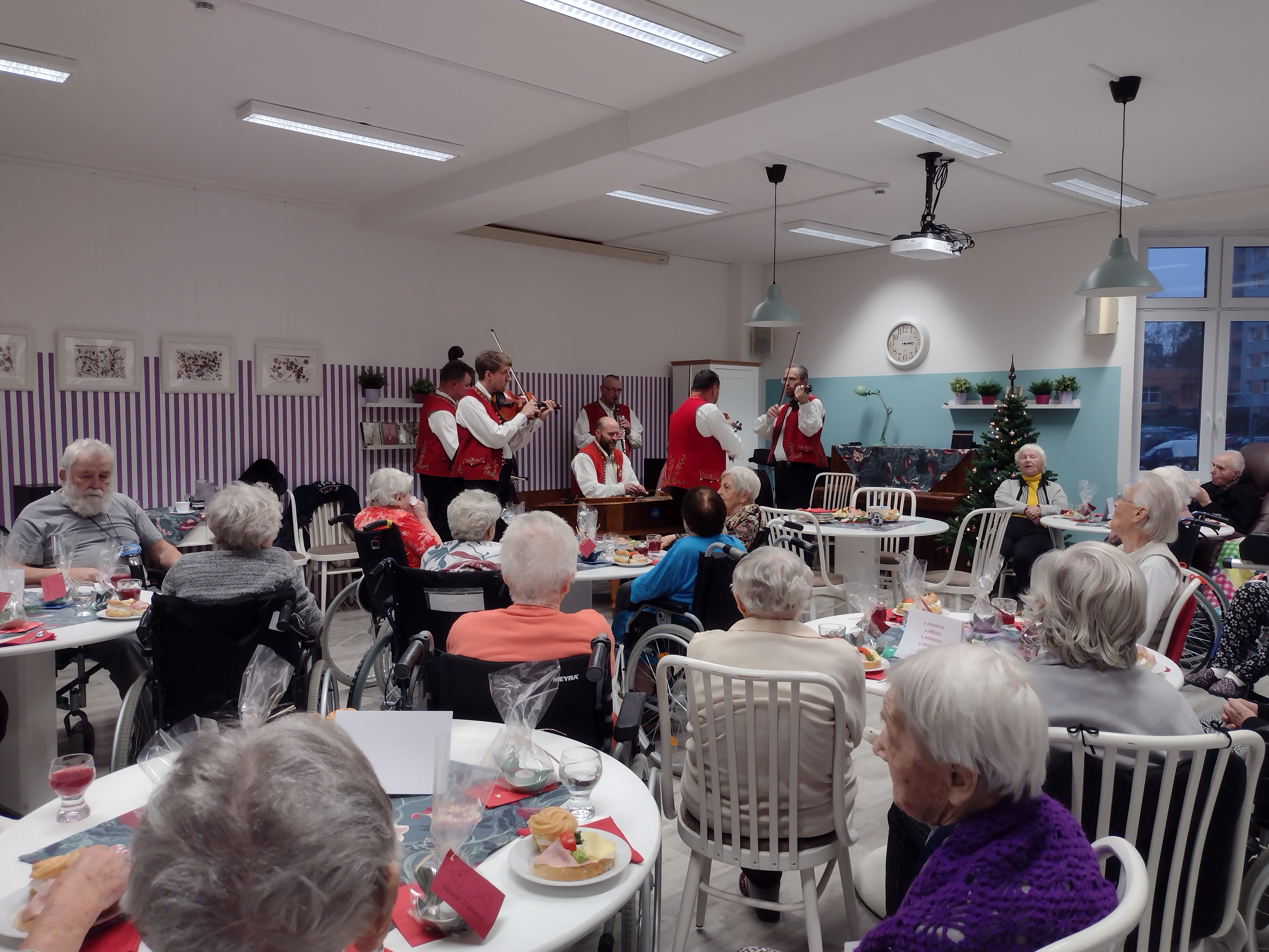 Ve čtvrtek 21. 12. 2023 jsme pro naše klienty uspořádali společenskou akci "Vánoční posezení". Při poslechu cimbálové muziky Kyničan jsme společně vítali letošní Vánoce. Sváteční atmosféru nám pomohlo navodit také podávané občerstvení, vůně punče, rozsvícený vánoční stromeček a svíčky hořící na každém stole. V závěru večera každý obdržel malý dárek - výrobek z výtvarné dílny našeho Domova. Klientům, kteří se akce nemohli zúčastnit, jsme občerstvení a dárky roznesly do bytů.