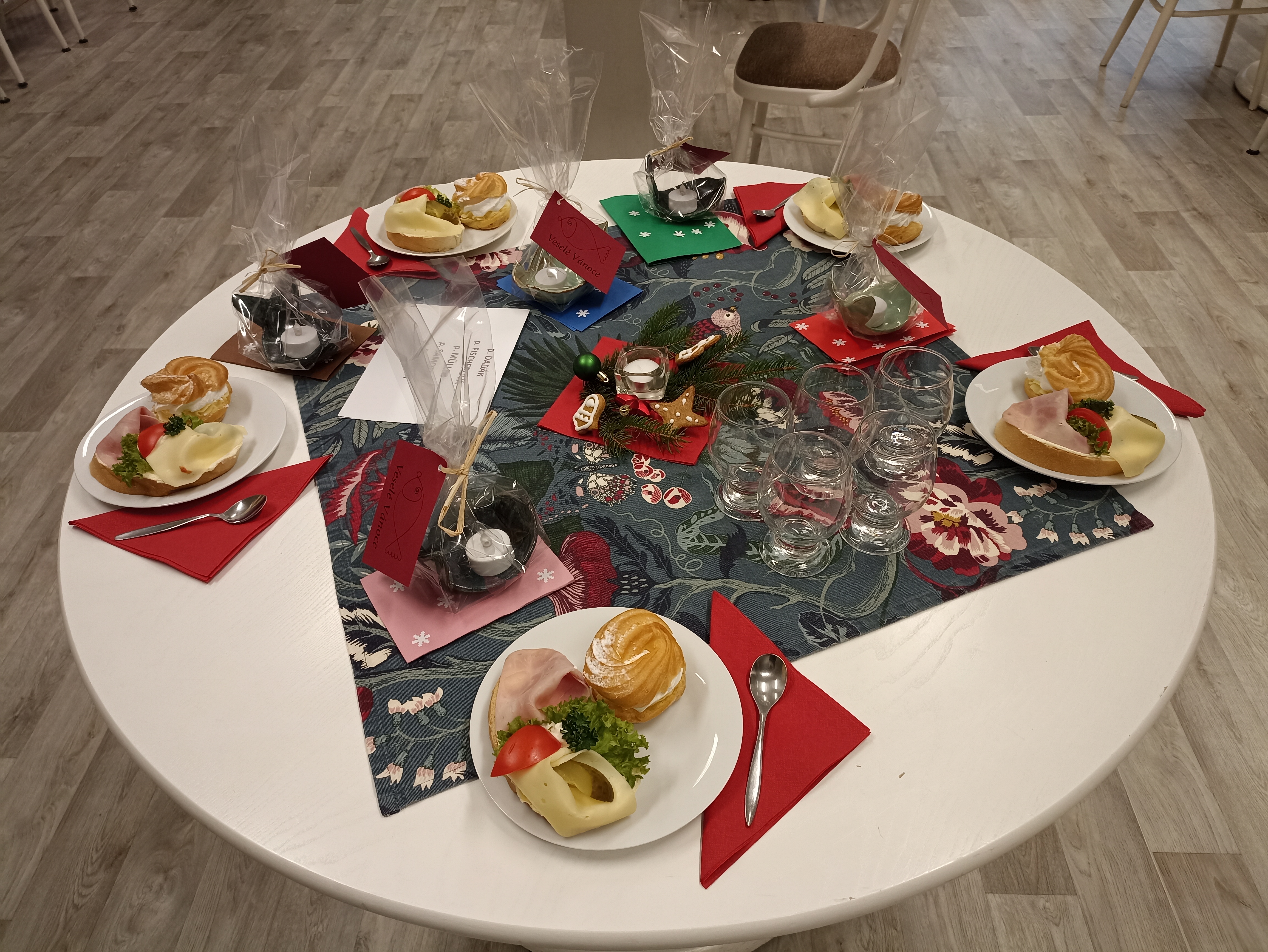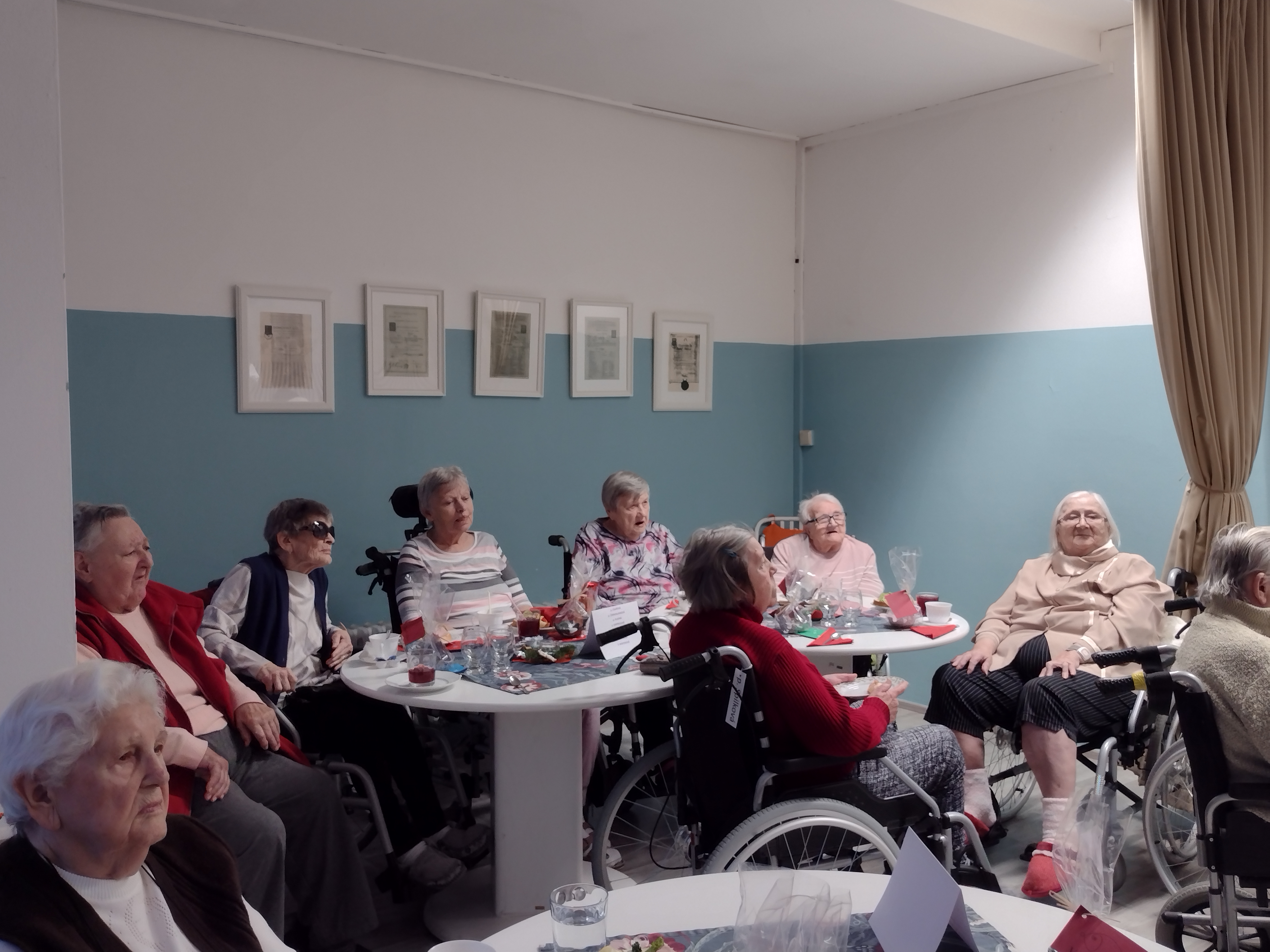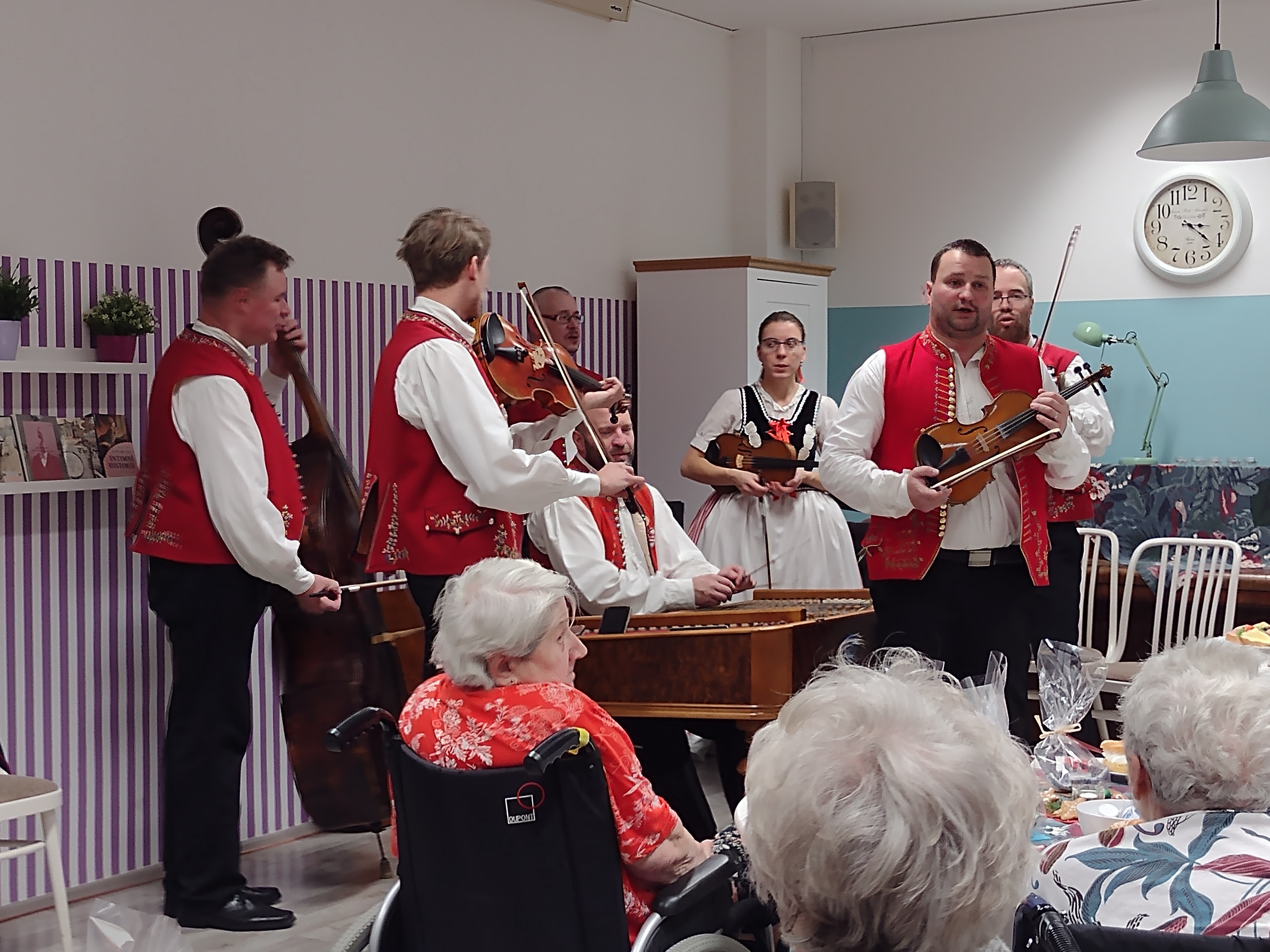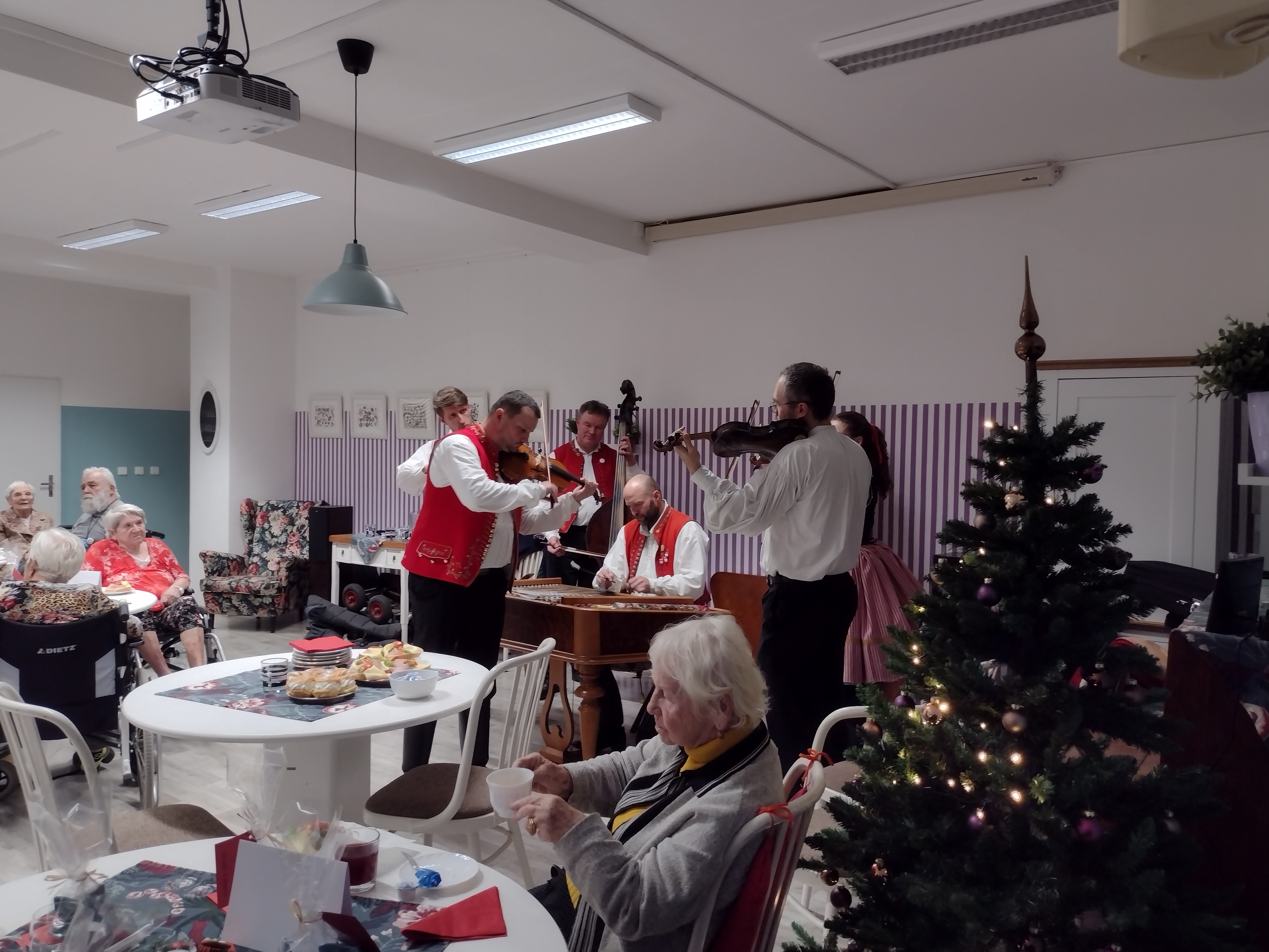 Ve čtvrtek 21. 12. 2023 jsme pro naše klienty uspořádali společenskou akci "Vánoční posezení". Při poslechu cimbálové muziky Kyničan jsme společně vítali letošní Vánoce. Sváteční atmosféru nám pomohlo navodit také podávané občerstvení, vůně punče, rozsvícený vánoční stromeček a svíčky hořící na každém stole. V závěru večera každý obdržel malý dárek - výrobek z výtvarné dílny našeho Domova. Klientům, kteří se akce nemohli zúčastnit, jsme občerstvení a dárky roznesly do bytů.