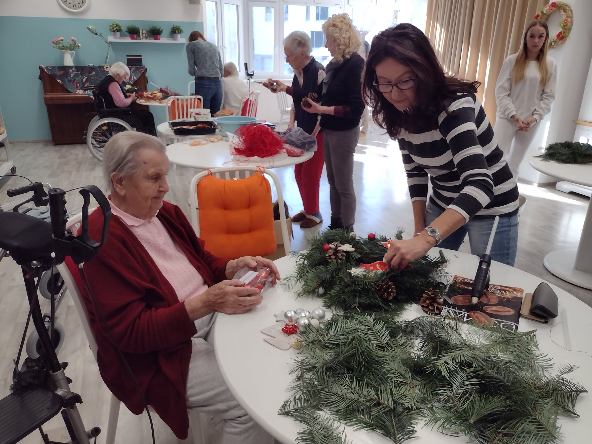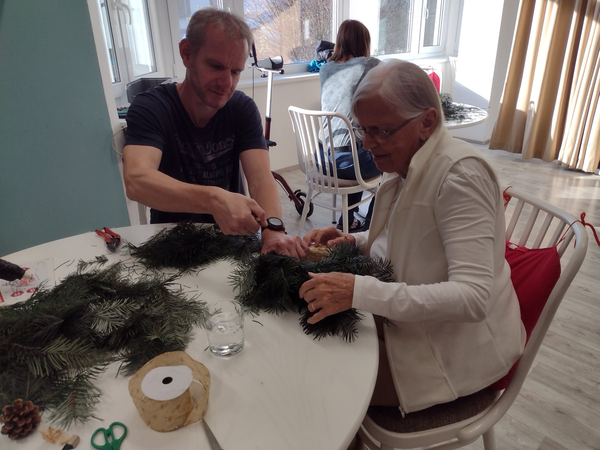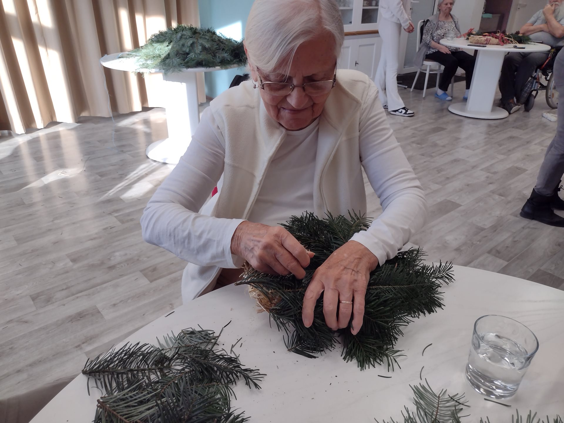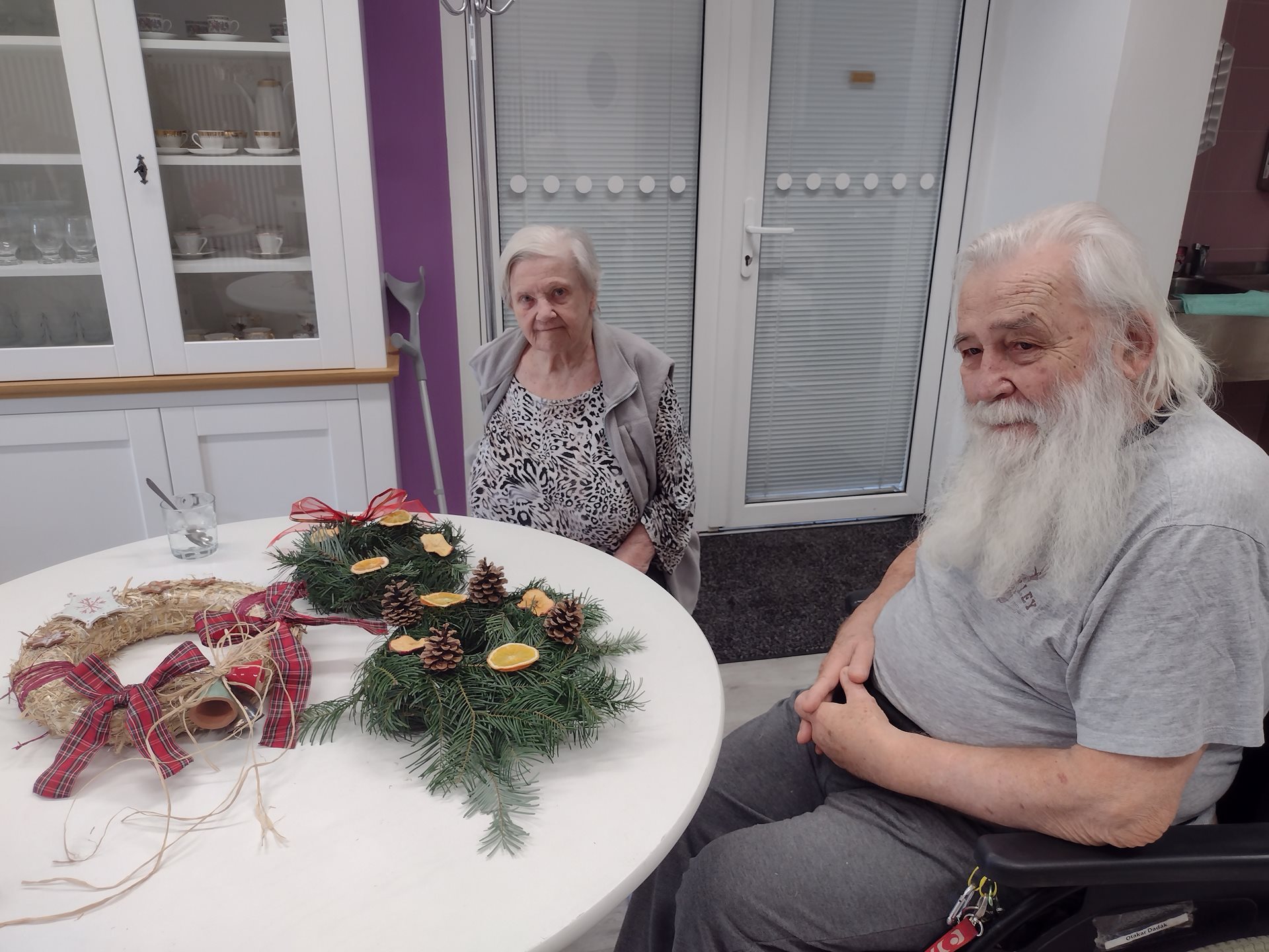 V týdnu od 25. do 28. 11. 2024 jsme každé dopoledne s klienty tvořili adventní věnce. Tradičně akce proběhla ve spolupráci s dobrovolnickou organizací Adra, o.p.s.. Jako každý rok se zahájení zúčastnil zahradník, pan Petr, který přinesl chvojí a názorně nám předvedl "jak na to". Letos poprvé se adventního tvoření účastnili také rodinní příslušníci klientů.