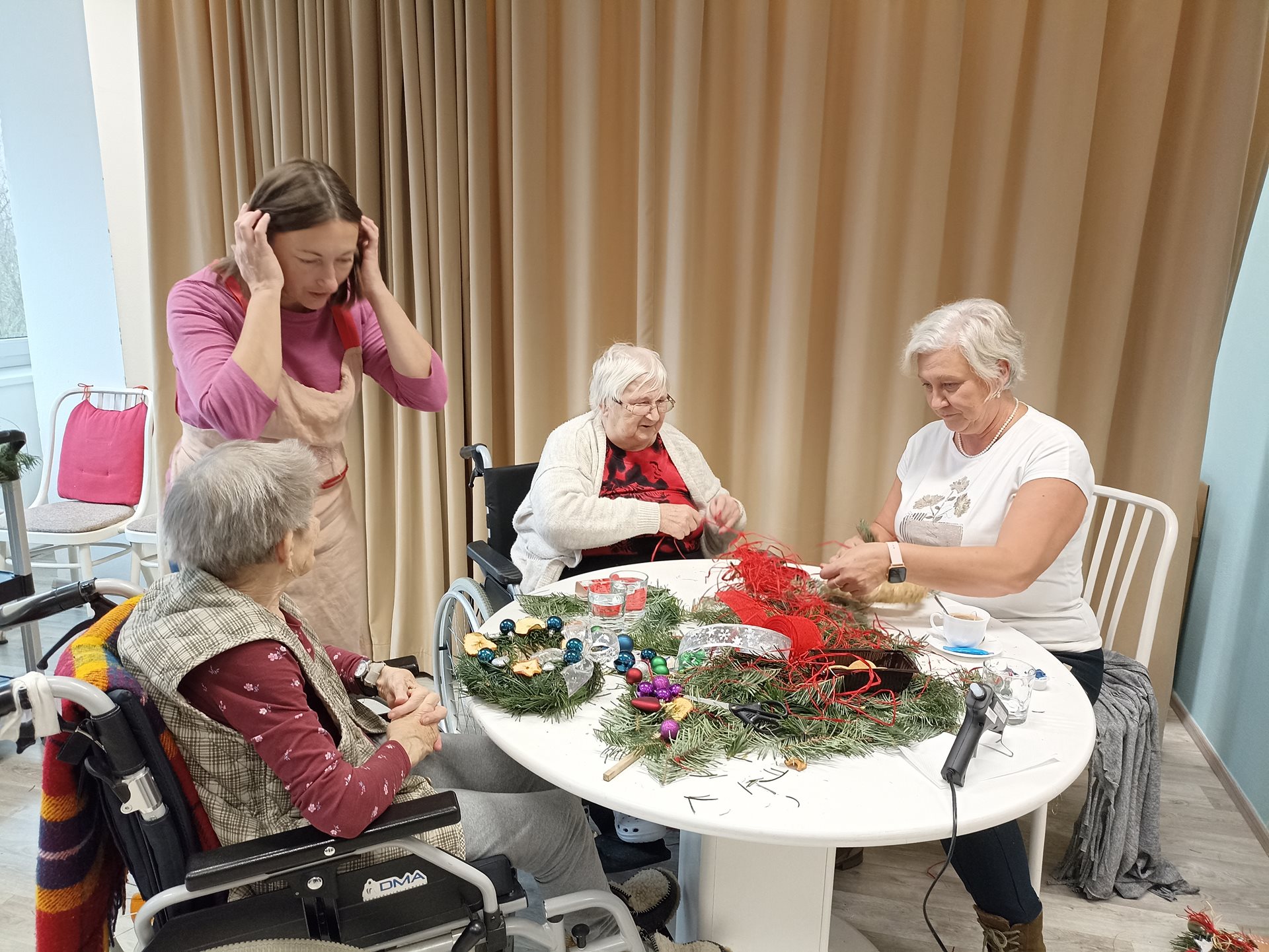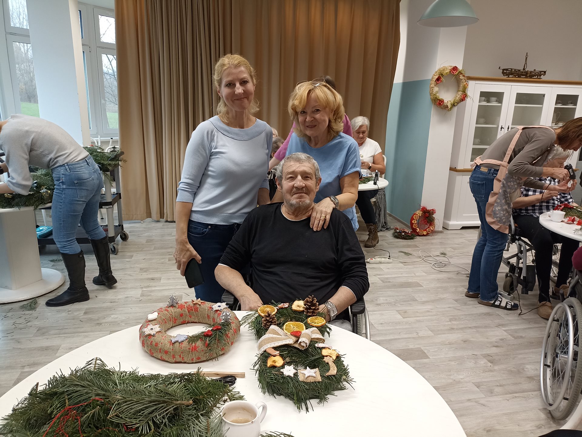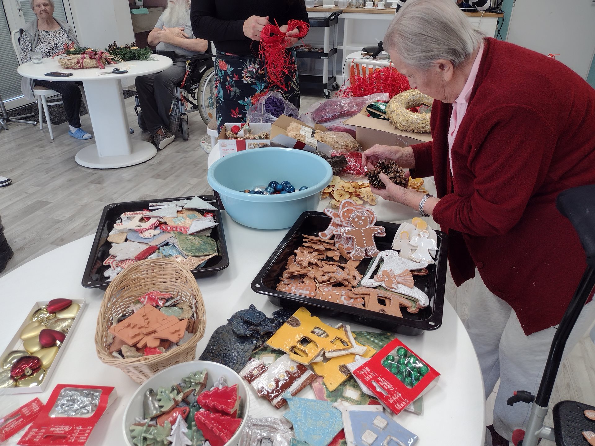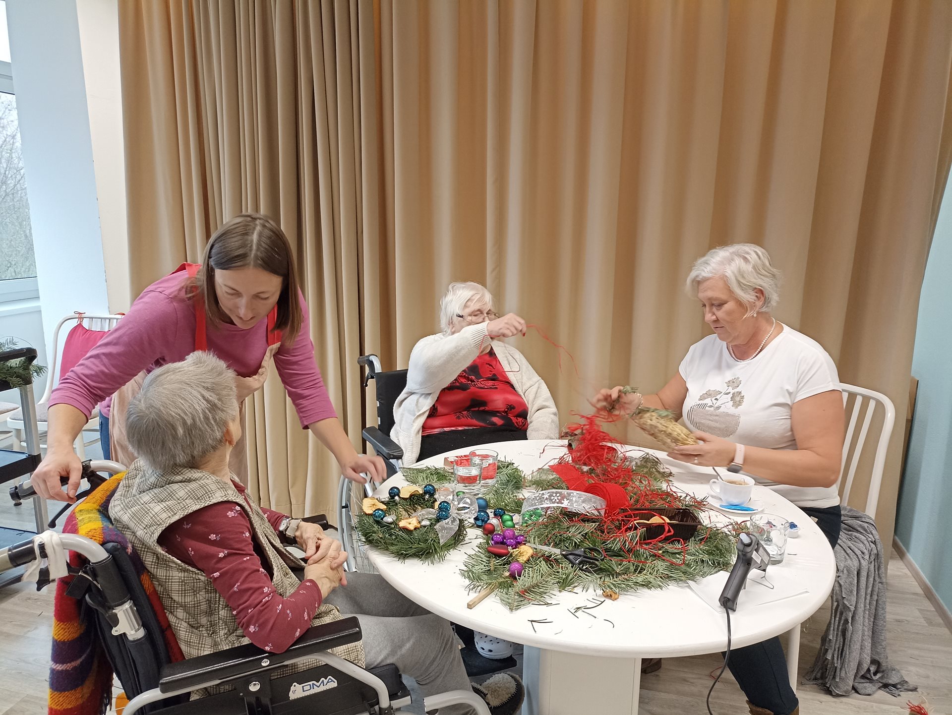 V týdnu od 25. do 28. 11. 2024 jsme každé dopoledne s klienty tvořili adventní věnce. Tradičně akce proběhla ve spolupráci s dobrovolnickou organizací Adra, o.p.s.. Jako každý rok se zahájení zúčastnil zahradník, pan Petr, který přinesl chvojí a názorně nám předvedl "jak na to". Letos poprvé se adventního tvoření účastnili také rodinní příslušníci klientů.