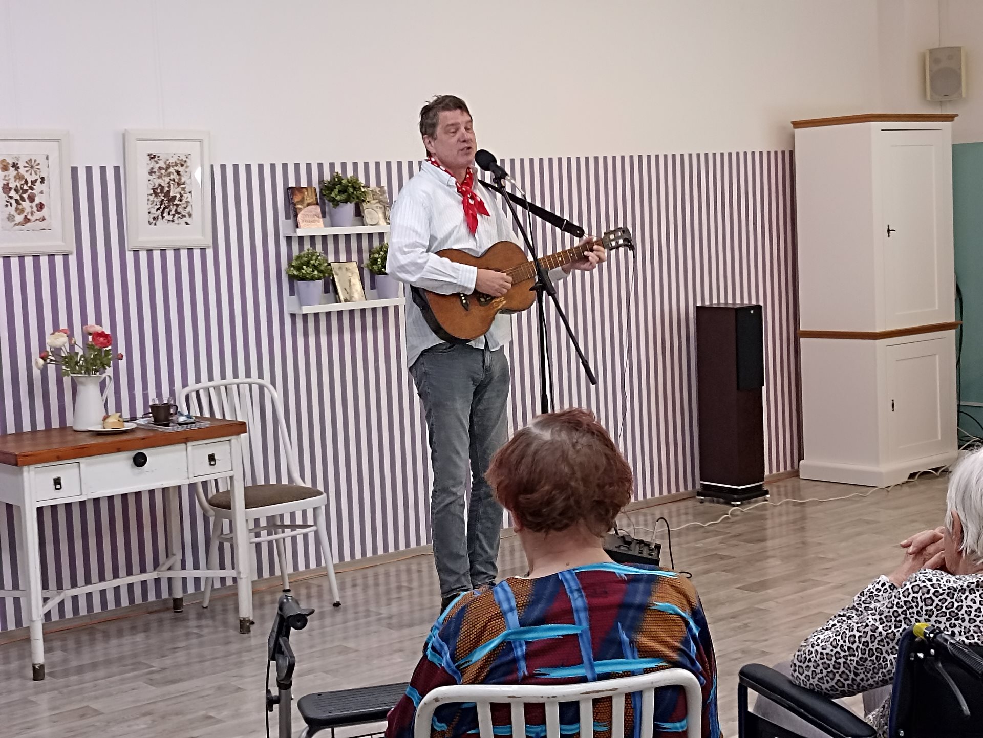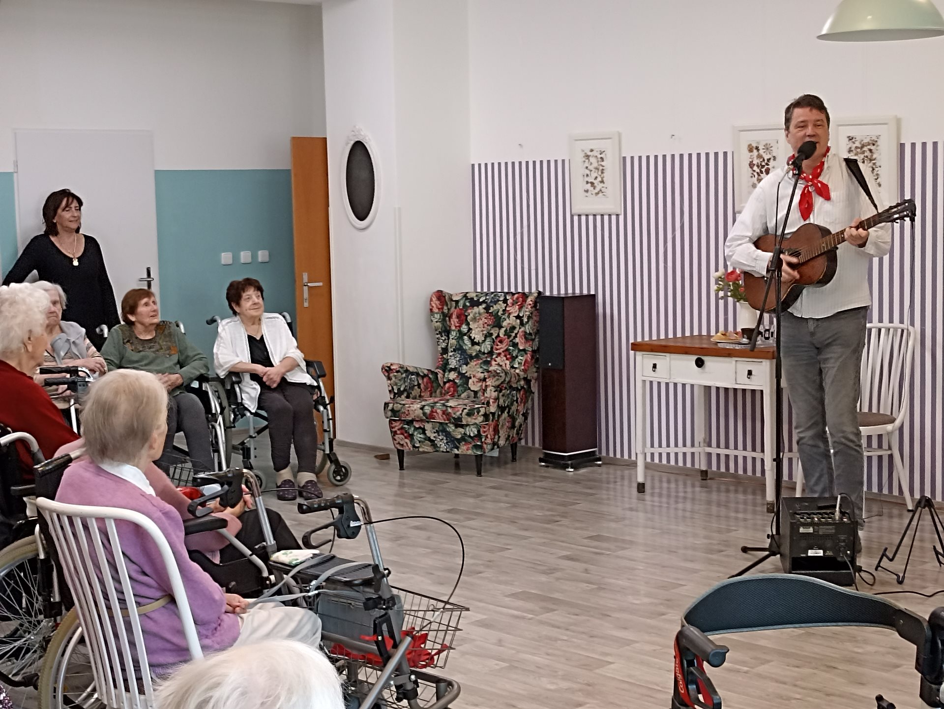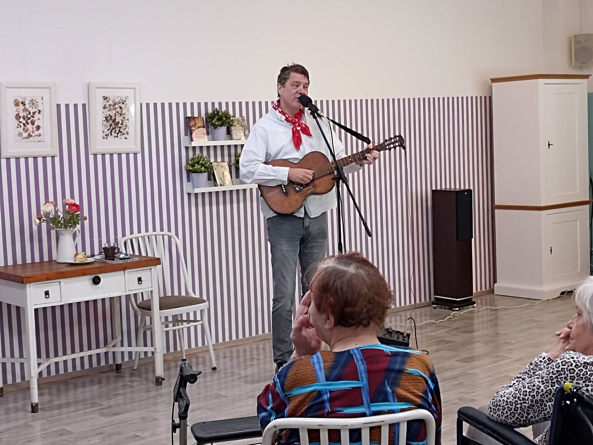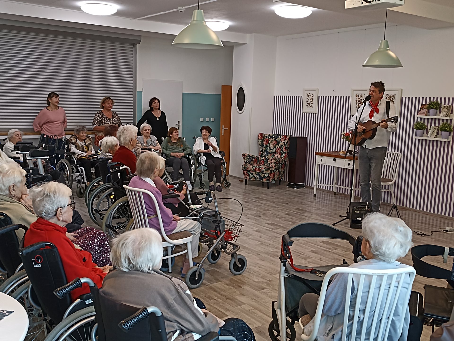 V úterý 30. 9. 2025 jsme pro naše klienty uspořádali hudební vystoupení pana Vladimíra Pecháčka (bývalého člena skupiny Šlapeto) u příležitosti Dne seniorů. Pro klienty jsme také nachystali občerstvení - chlebíček a zákusek, které jsme po akci roznesli všem klientům do pokojů.